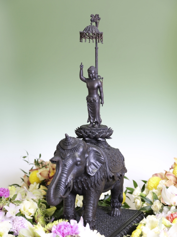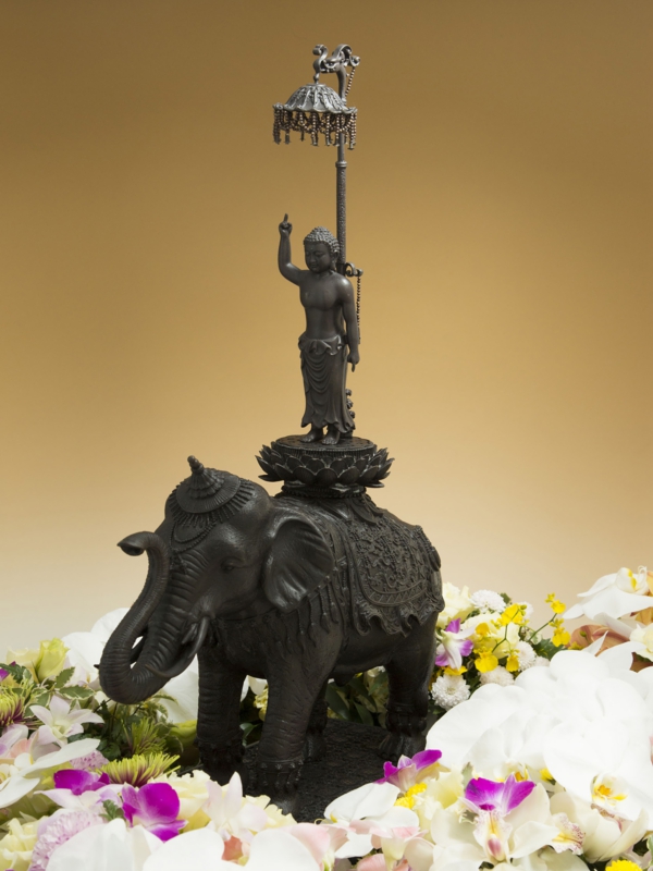 右手を天に 左手を地に指差し、六牙の象に乗られる誕生仏。毎年 4 月 8 日には世界各国でお祀りされ、世界中の人々が お釈迦様の御生誕に感謝します。