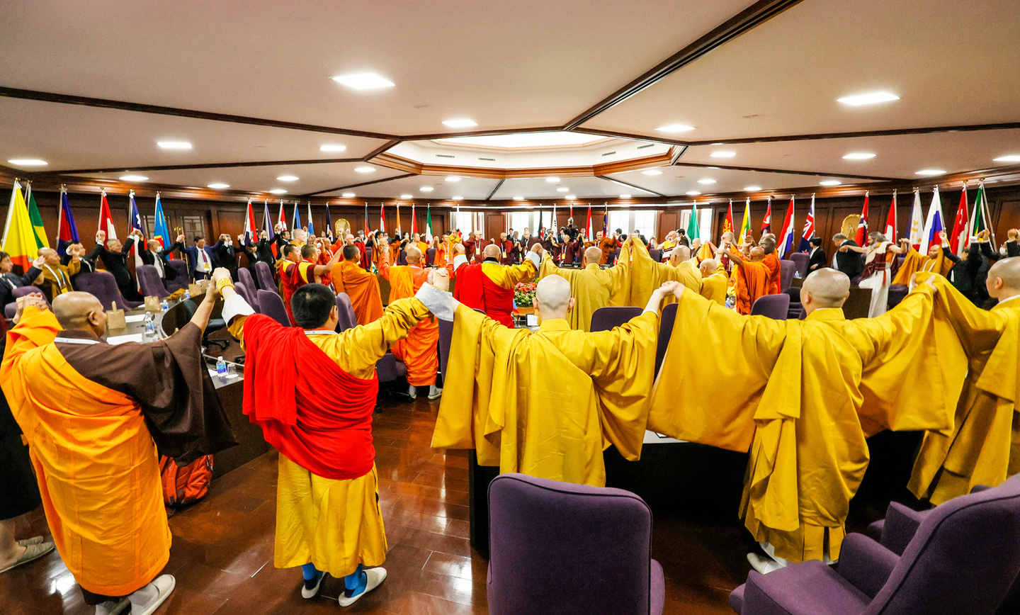 円卓会議では、世界の平和と人類の安寧を願って、全世界五大陸の仏教最高指導者が議論をかわし、力を合わせて取り組むことが誓われました。