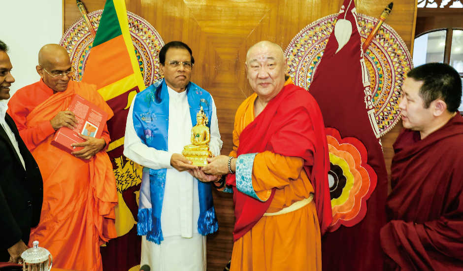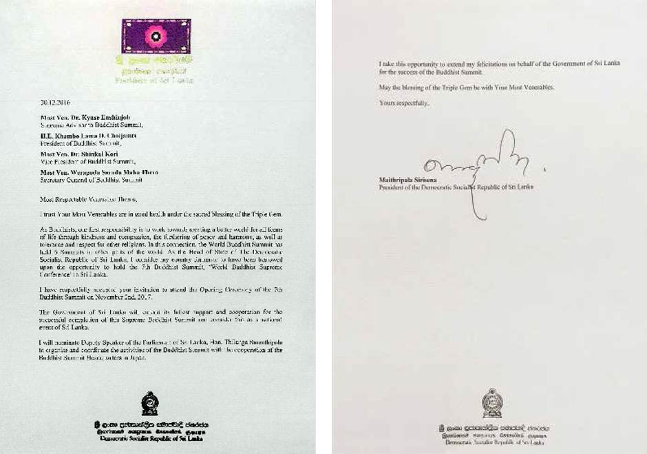 スリランカ大統領 マイトリパラ・シリセナ閣下との御会見を通じて、佛教サミットをスリランカ政府主催により開催することを明言され、国を挙げての全面的な支援と協力を約束されると共に、佛教サミットの成功を願って、固い握手を交わされました。
