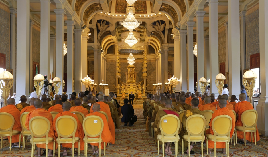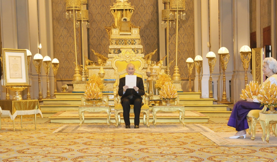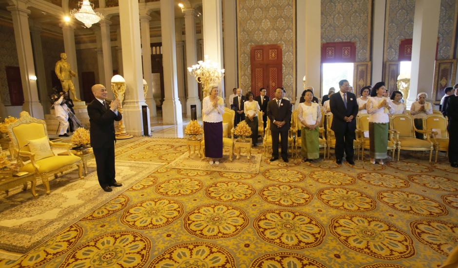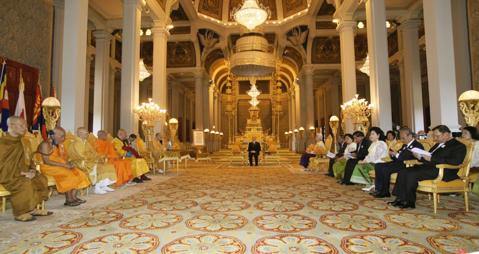 ノロドム・モニーク皇太后陛下が見守る中 宮殿 玉座にて御挨拶をされる