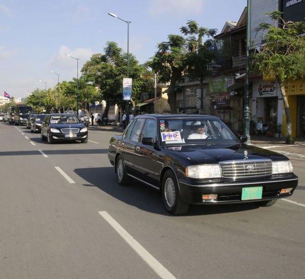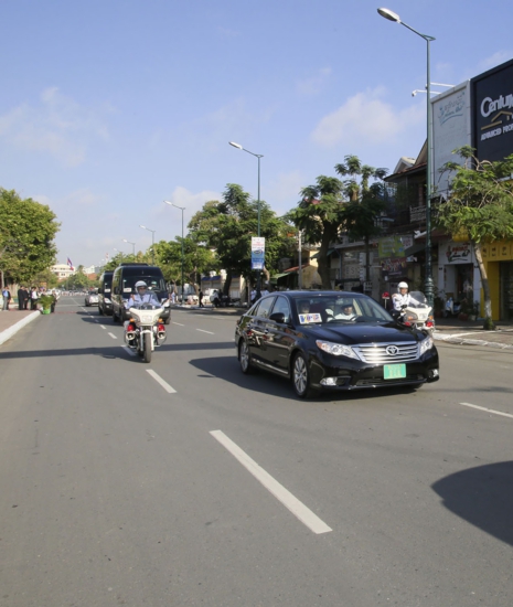 カンボジア王室紋章入りの特別車両 車列の左右に 白バイが護衛