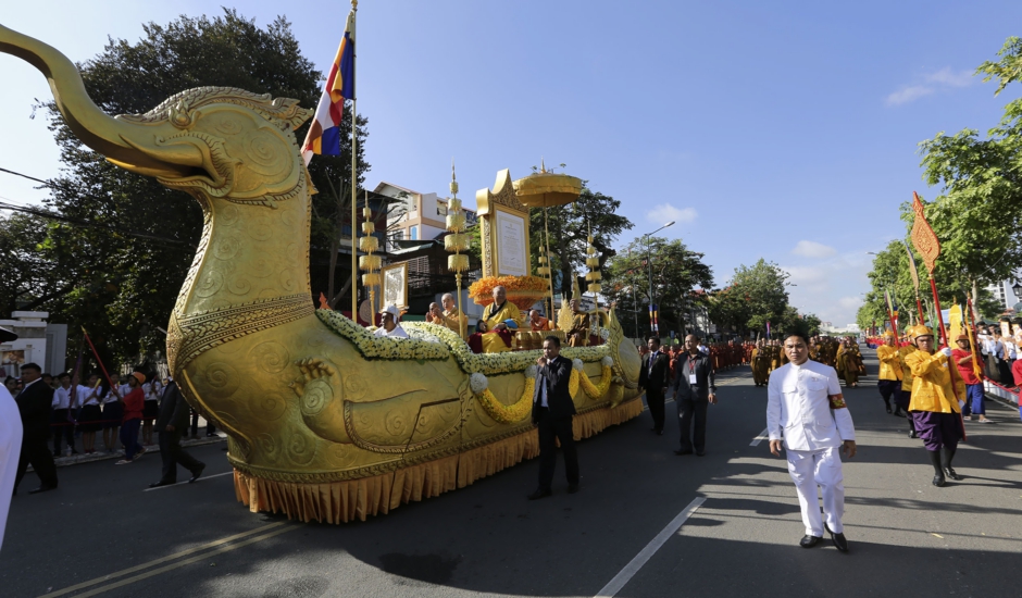 カンボジア王室の方々並びに 仏旗を持つ僧侶