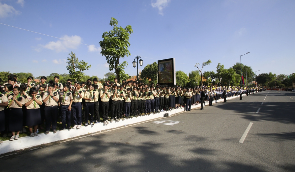 仏旗・佛教サミット旗・仏教の日旗を掲げて行進する王室護衛兵