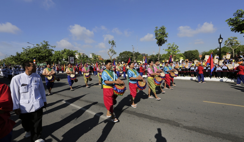 祝祭の曲を吹奏して行進する カンボジア国軍 軍楽隊