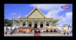 (クメール語に同時通訳され宮殿前の 1 万名以上の僧侶 国民が6 台の巨大モニターを通して拝聴)