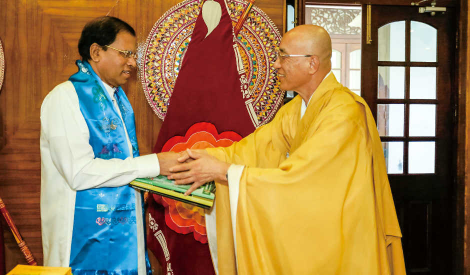スリランカ大統領 マイトリパラ・シリセナ閣下との御会見を通じて、佛教サミットをスリランカ政府主催により開催することを明言され、国を挙げての全面的な支援と協力を約束されると共に、佛教サミットの成功を願って、固い握手を交わされました。