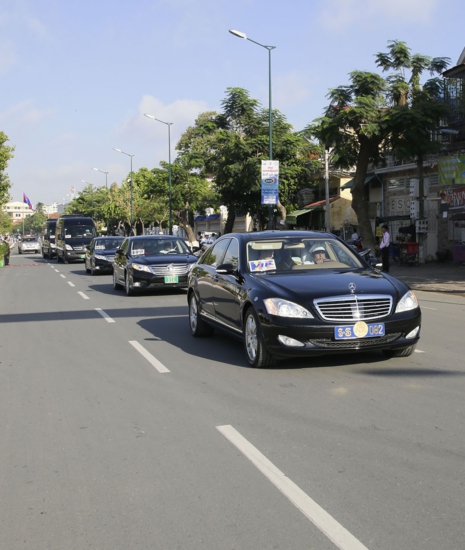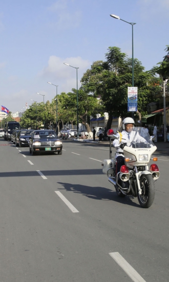 カンボジア王室紋章入りの特別車両 車列の左右に 白バイが護衛