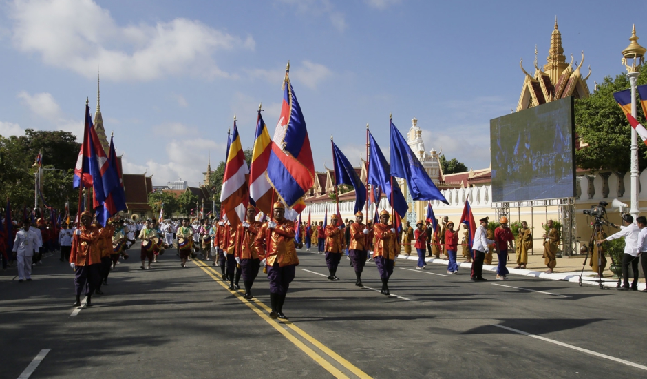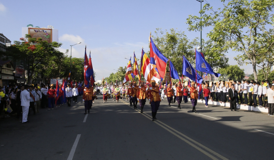 仏旗・カンボジア国旗・王室旗を掲げて お練りを先導する伝統衣装に身を固めた 王室護衛兵