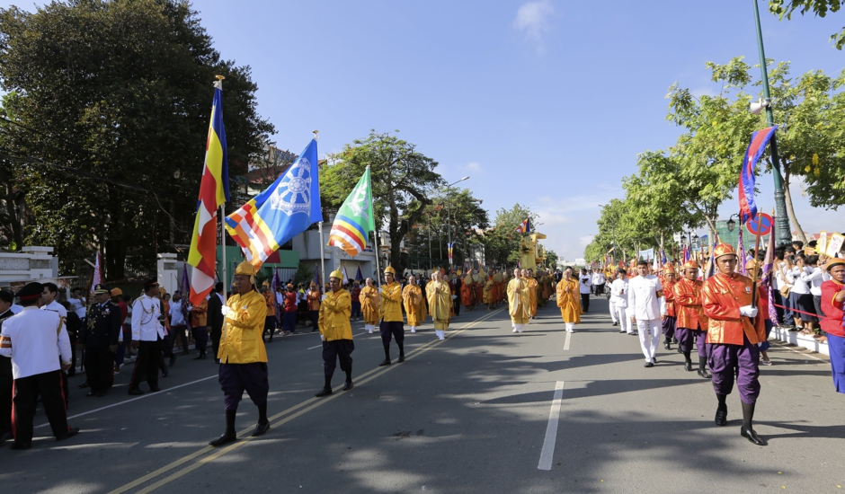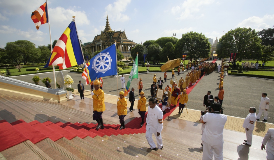 カンボジア王室の方々並びに 仏旗を持つ僧侶