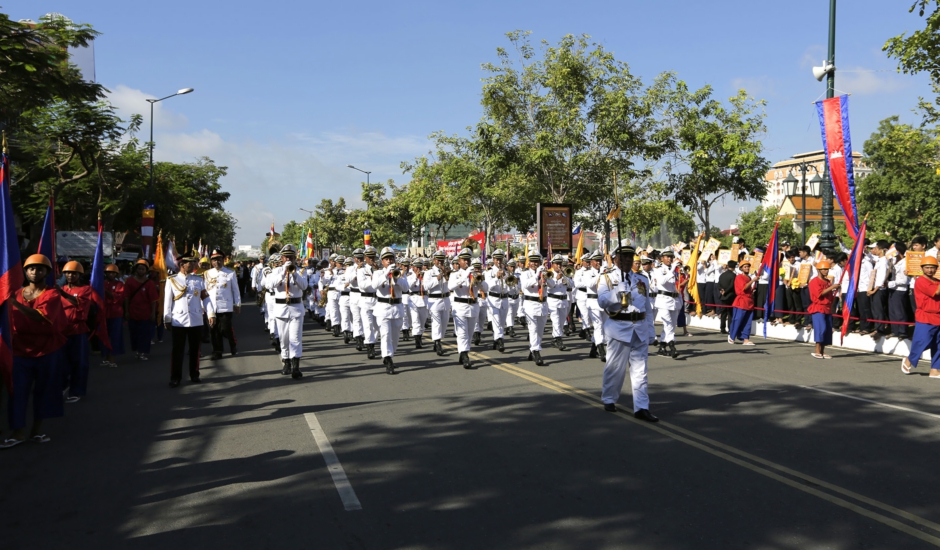祝祭の曲を吹奏して行進する カンボジア国軍 軍楽隊