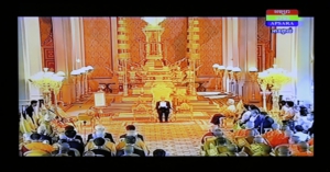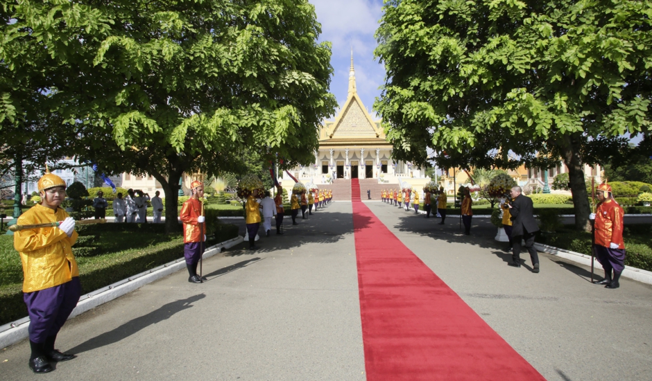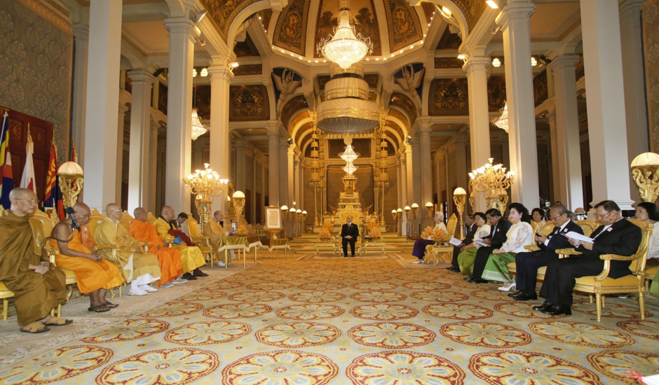 ノロドム・モニーク皇太后陛下が見守る中 宮殿 玉座にて御挨拶をされる